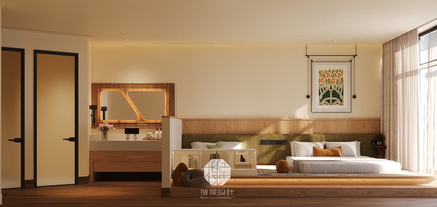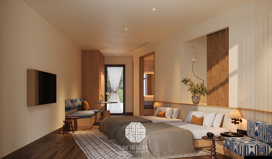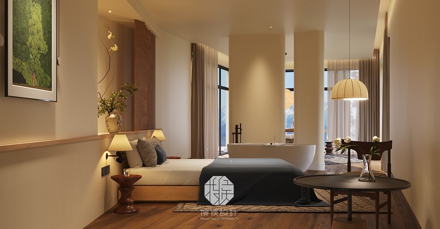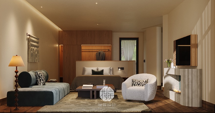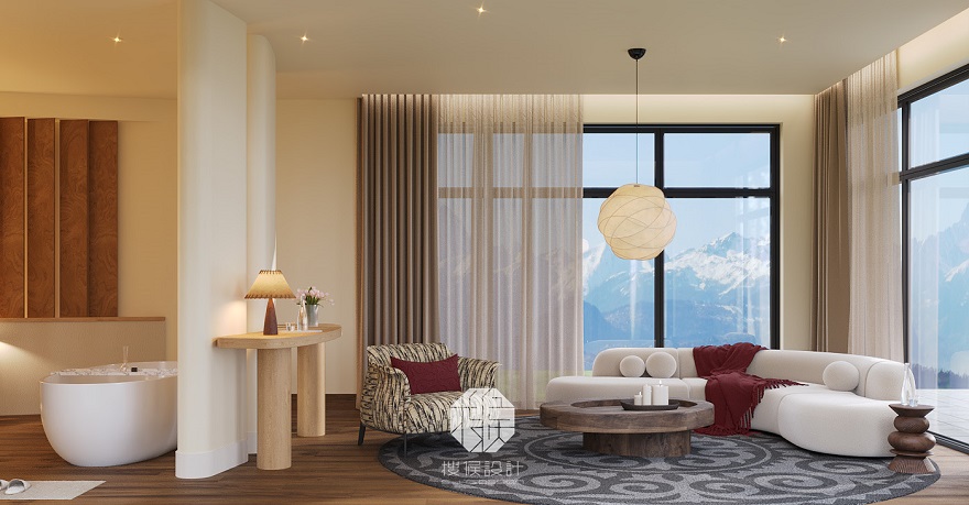 <特克斯山麓水岸民宿二期>建筑外观打破了传统的方正格局,巧妙地融入斜线元素,让建筑整体更有张力,呈现代简约风格,室内空间整体以现代元素打底,与国际风格接轨;以米色、木色等暖色调为主,营造温馨、自然的氛围