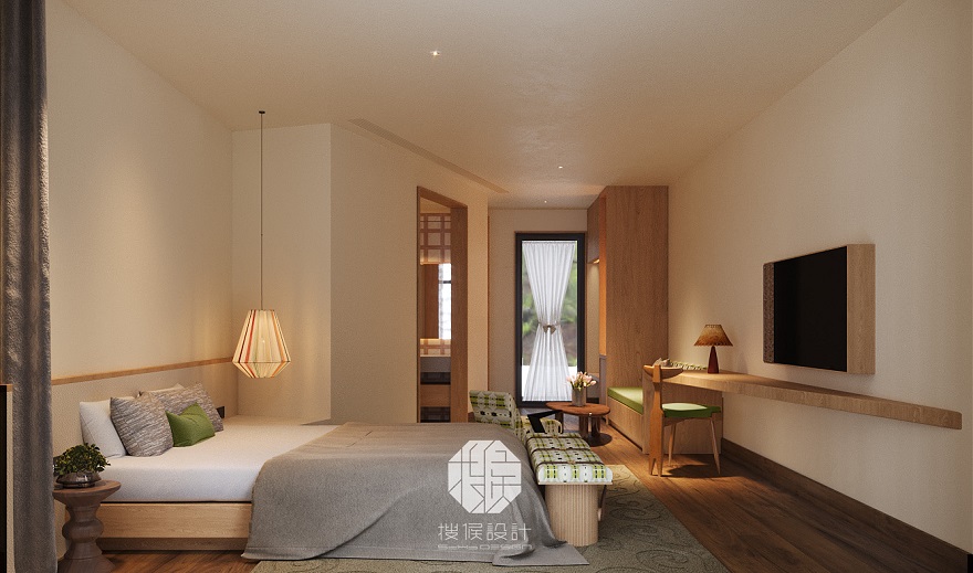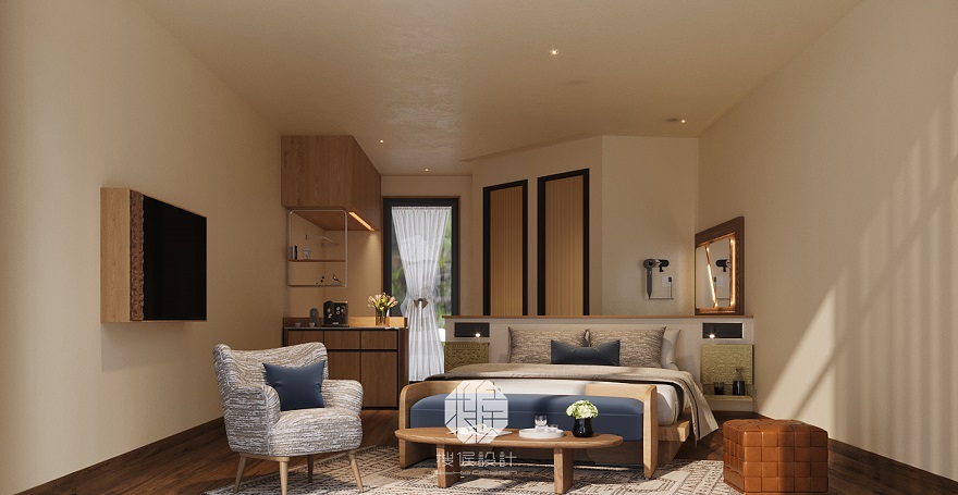 <特克斯山麓水岸民宿二期>建筑外观打破了传统的方正格局,巧妙地融入斜线元素,让建筑整体更有张力,呈现代简约风格,室内空间整体以现代元素打底,与国际风格接轨;以米色、木色等暖色调为主,营造温馨、自然的氛围